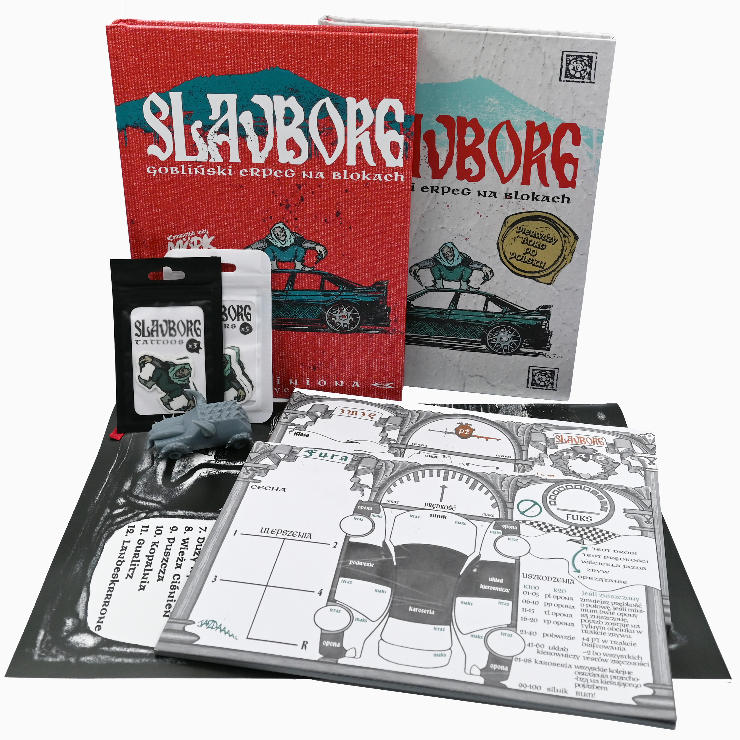 Paczka zawiera: podręcznik do Slav Borga, podręcznik do Slav Borga w Zgoblinionej Edycji wraz z dostępem do wersji cyfrowej, notatniki z kartami postaci, notatniki z kartami pojazdów, mapę Zgola, tatuaże, naklejki i nostalgiczną niespodziankę. Do każdego Kufra Prezentów dodajemy wydrukowaną w żywicy figurkę Demonicznego Gobwagena z przygody startowej z podręcznika do Slav Borga gratis!
